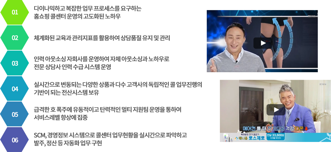 ![]() 정보(information)와 광고(commercial)의 합성어인 인포머셜 홈쇼핑은 케이블 TV를 통해 상표나 상품 관련 정보를 제공하여 소비자의 즉각적인 반응을 얻기 위한 광고 기법 으로 제품홍보와 매출효과, 제품정보 전달력이 우수한 광고 분야입니다. 본사에 구축된 600여석의 홈쇼핑 사업부 콜센터에서 인포머셜 홈쇼핑 광고를 진행하는 고객사의 제품/서비스에 대한 주문접수,CS상담 등의 콜센터 상담업무를 대행 운영하고 있습니다. |